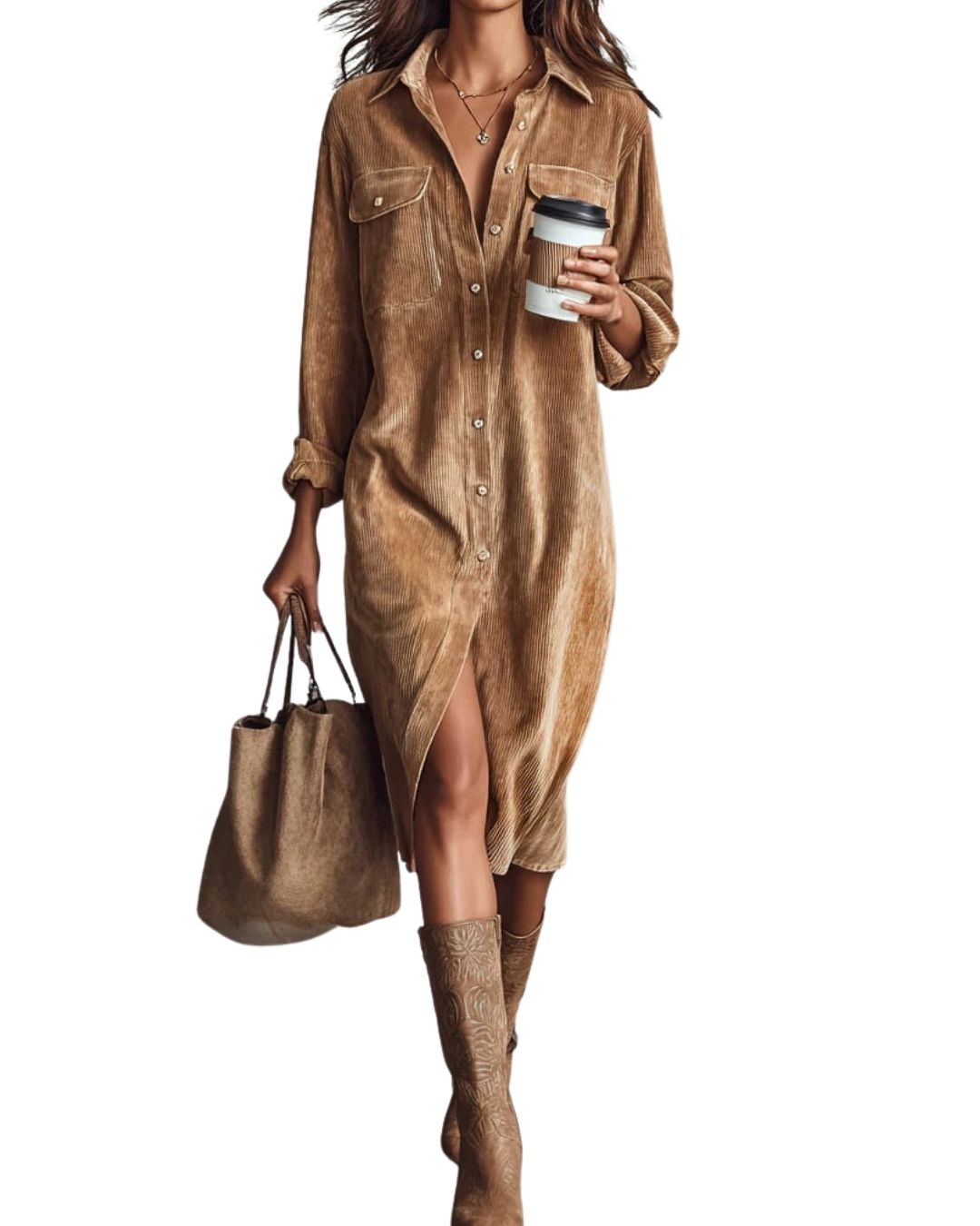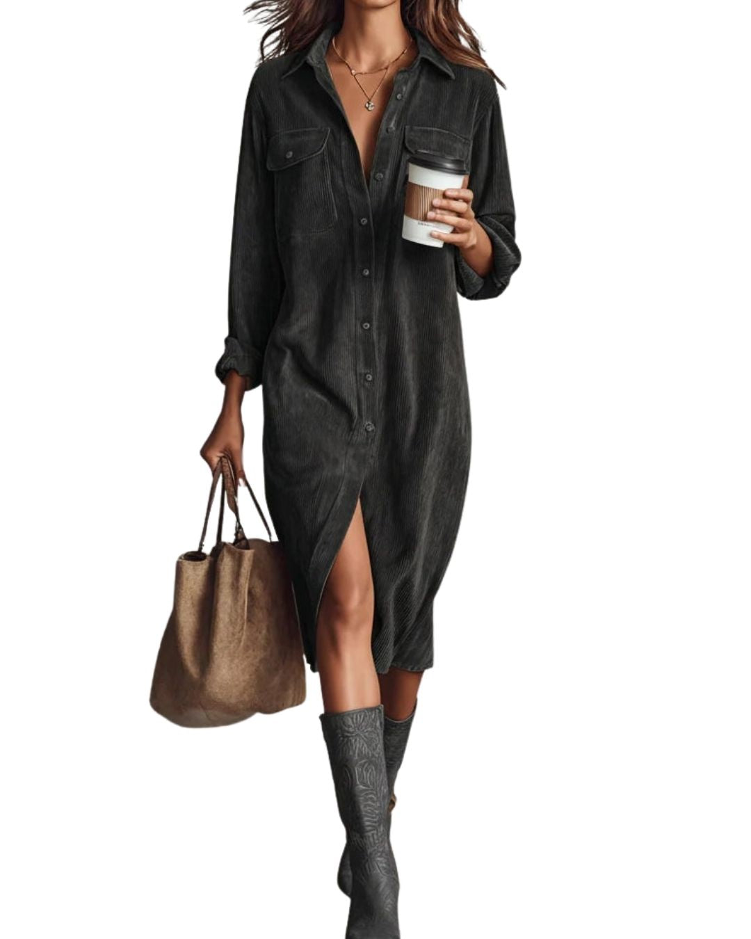 - Croiu Larg și Lejer: Silhouetta relaxată cu mâneci lungi și guler clasic îți oferă libertate totală de mișcare, iar lungimea midi adaugă o eleganță discretă fiecărei ținute.